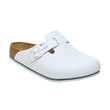Our best-selling clog, retooled to help you get the job done. The Boston Pro brings on-your-feet functionality from top to bottom a fluid-resistant, PU-coated leather upper, durable, slip-resistant TPU outsole and pronounced tread recreates the style with safety in mind. Featuring legendary Birkenstock design elements, like a contoured cork-latex footbed that supports you through long hours on your feet.